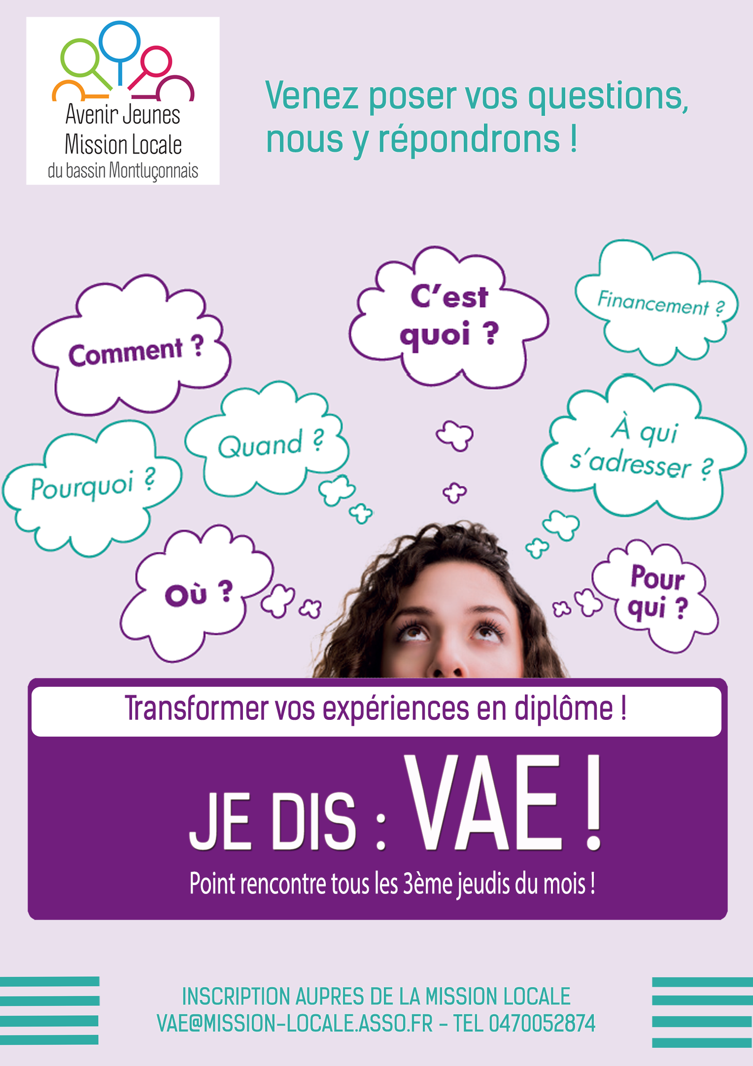 Tous les 3ème jeudis du mois, les conseillères de la Mission Locale formées à la VAE (Validation des Acquis de l’Expérience) accueillent les jeunes qui souhaitent être accompagnés et suivis dans cette démarche pour assurer leur réussite dans ce parcours souvent long et difficile.