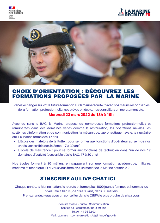 La Marine Nationale organise régulièrement des événements « Live Chat » sur son site lamarinerecrute.fr afin de présenter aux éventuels candidats l’offre employeur riche de notre institution. Ainsi, la semaine prochaine, le mercredi 23 mars 2022 à 18h dans la rubrique « échanger avec nos ambassadeurs » de leur site internet aura lieu le « Live Chat » : « Choix d’orientation : découvrez les formations proposées par la Marine ».