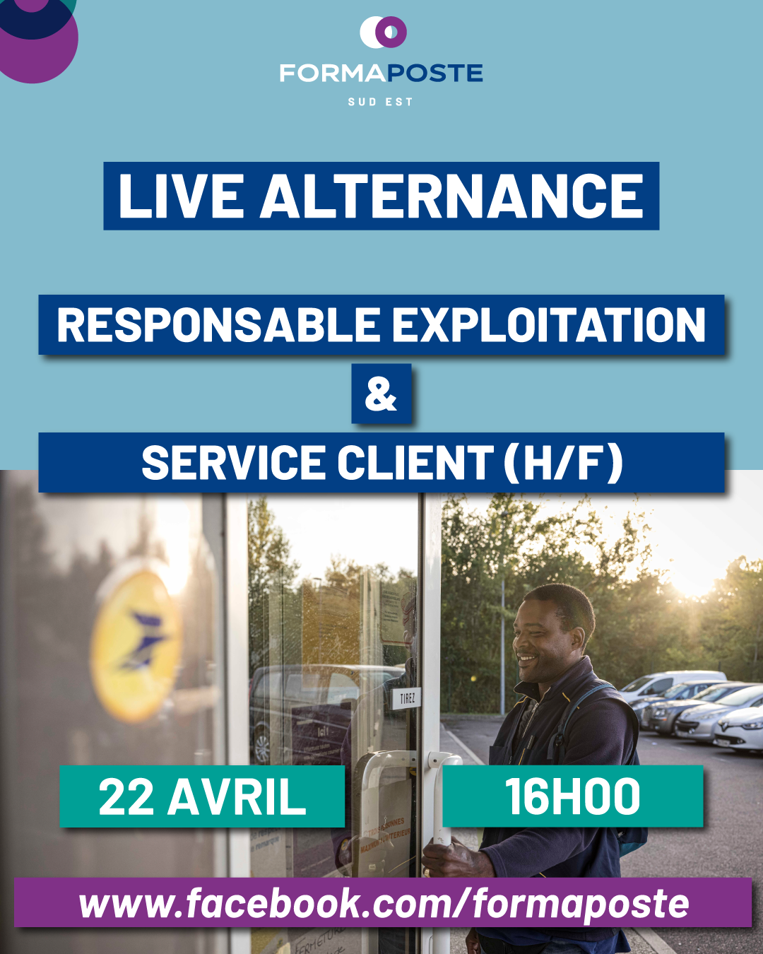 Le vendredi 22 avril 2022 à 16h Formaposte part en live sur le métier de Responsable Exploitation et Service Client (H/F) en alternance.