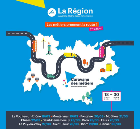 Pour sa troisième édition, une quinzaine de véhicules, engins de démonstration, stands vont sillonner, 𝙙𝙪 18 𝙖𝙪 30 𝙢𝙖𝙧𝙨 2024, les routes de la région Auvergne-Rhône-Alpes pour aller à la rencontre des collégiens, lycéens, étudiants, parents, professionnels en reconversion, demandeurs d’emploi… en quête d’informations sur leur orientation scolaire et professionnelle.